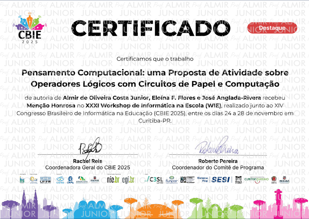 No dia 28/11, a comissão organizadora do XXXI Workshop de Informática na Escola (WIE 2025), evento satélite do XIV Congresso Brasileiro de Informática na Educação (CBIE 2025), concedeu ao artigo “Pensamento Computacional: uma Proposta de Atividade sobre Operadores Lógicos com Circuitos de Papel e Computação Física” um certificado de menção honrosa.